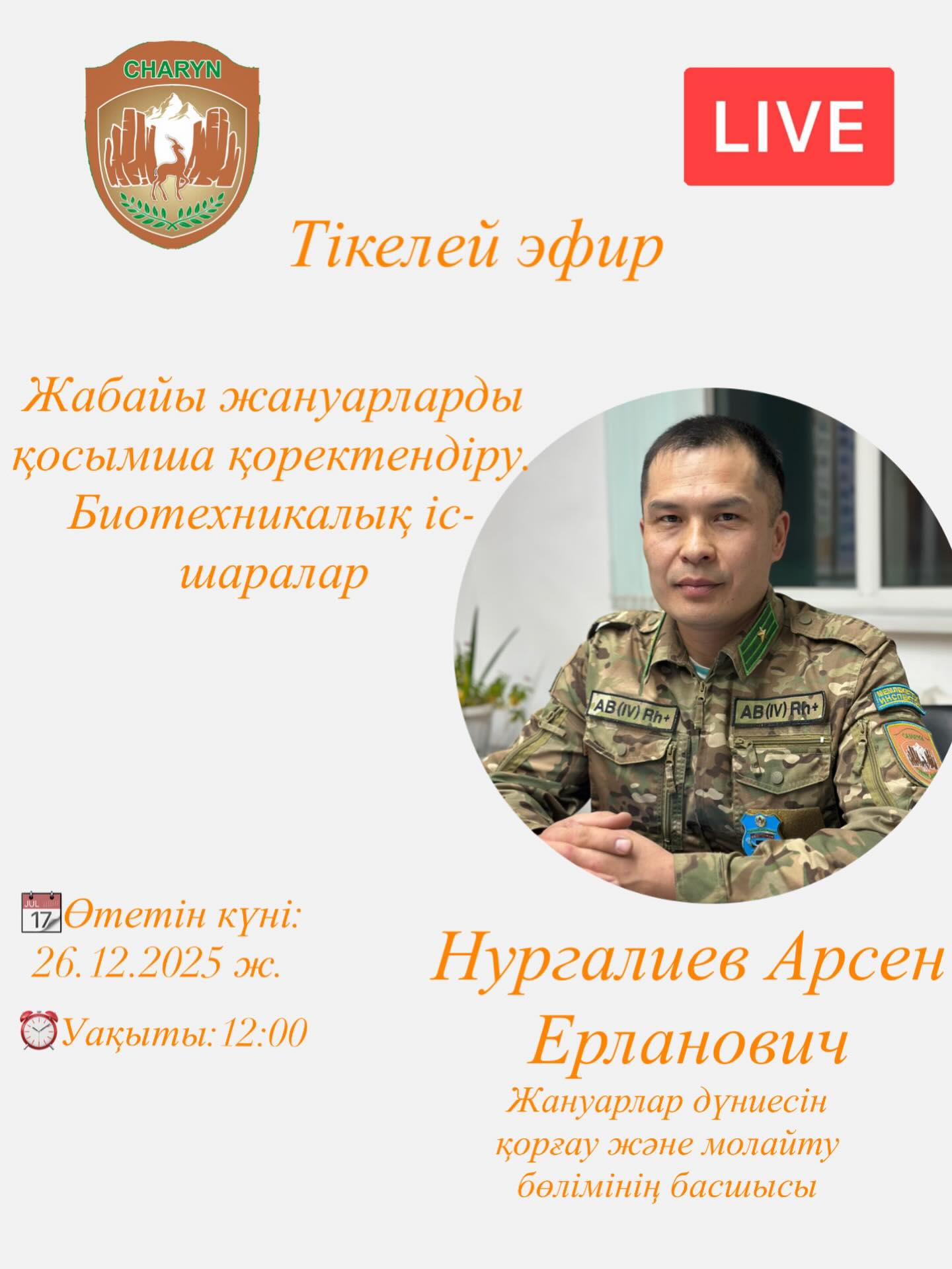 26.12.2025-ші жылы Шарын мемлекеттік ұлттық табиғи паркінің Жануарлар дүниесін қорғау және молайту бөлімінің басшысы Нургалиев Арсен Ерлановичтің қатысуымен тікелей эфир өтеді.