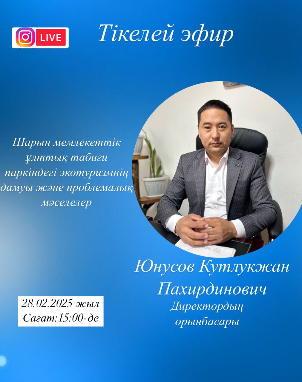 28.02.2025-ші жылы Шарын мемлекеттік ұлттық табиғи паркінің директорының орынбасары Юнусов Кутлукжан Пахирдиновичтың қатысуымен тікелей эфир өтеді.