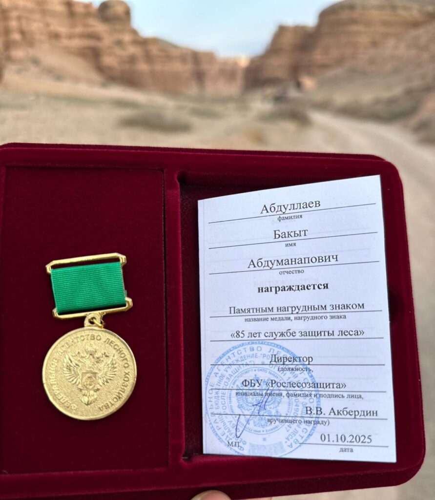 Шарын мемлекеттік ұлттық табиғи паркінің “Ғылым” бөлімінің басшысы Абдуллаев Бақыт Абдуманапұлы Ресей Федерациясының Орман шаруашылығы федералдық агенттігінің 01.10.2025 жылғы № 355 бұйрығына сәйкес, Орманды қорғау қызметін дамыту мен қалыптастыруға қосқан үлесі, орманды қорғау және молайту саласындағы жемісті еңбегі мен сіңірген еңбегі үшін “Орман қорғау қызметіне 85 жыл”төсбелгісімен марапатталды.